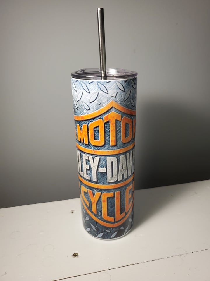 20 oz double wall customized stainless steel tumbler which does include a reusable plastic straw and upgraded leak proof lid.